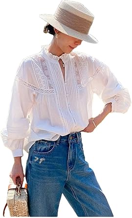 Women Lace Blouse Floral Cotton Loose Sheer Hollow Out Vintage Vocation Casual Shirts