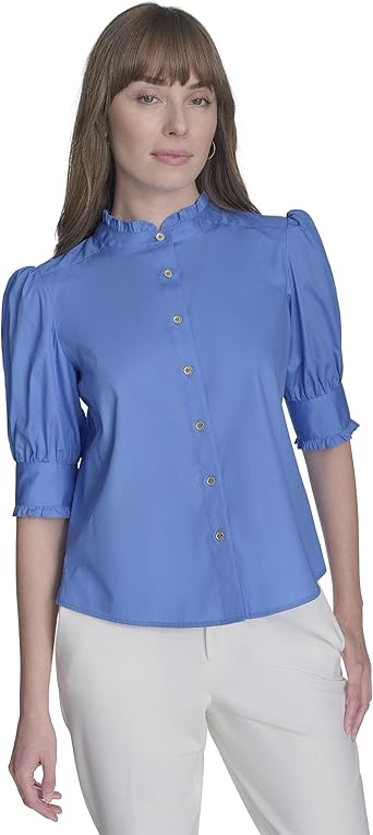 Women's Short Sleeve Ruffle Neck Button Front Shirt