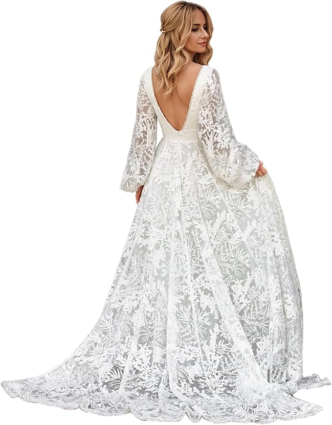 Women's V Neck Lace Wedding Dresses for Bride 2025 Lace Appliques A Line Beach Wedding Gown