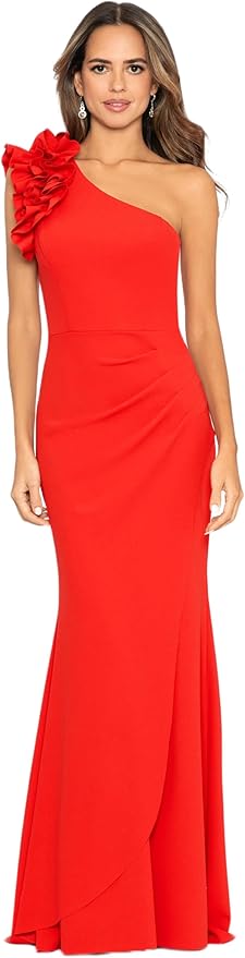 Women's Long One Shoulder Ruffle Scuba Crepe Dress (Standard & Petite)