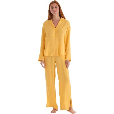 Women's Yellow Fashion Woven Regular Satin Long Sleeve Collar Shirt Pyjama Top
