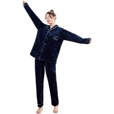 Women's Plush Fleece Pajamas Set,Long Sleeve 2-Piece Button-Down Pajamas Thick Sleepwear Lounge Sets Navy XL