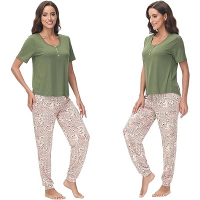 Women's Casual, Relaxed Fit Loungewear Pajama Set with Floral Print Ankle Cuff Trouser