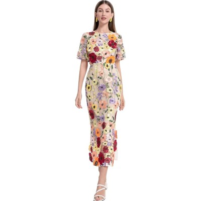 Women's 3D Floral Short Sleeves Crew Neck Fishtail Mesh Embroidery Party Cocktail Maxi Dress