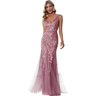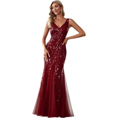 Women's Formal Dress Sequin Tulle Double V-Neck Sleeveless Mermaid Long Evening Dress 07886