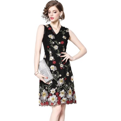 Womens Sleeveless V Neck Allover Floral Embroidered Evening Cocktail Dress